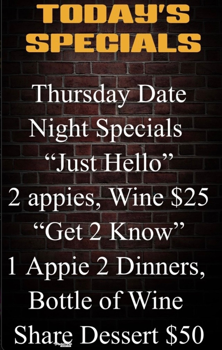 Come on and chill....we have a Bottle of our house wine, and two appies for $25, or the "Get 2 Know" special, a Bottle of our house wine, 1 Appie, 2 entrees for $50,